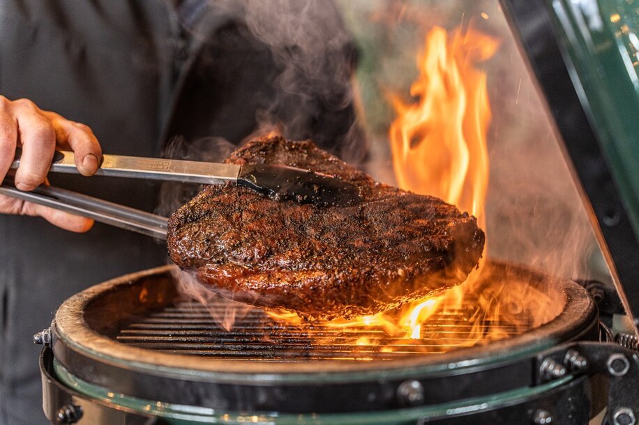 De kamado stond stevig op een pallet, alle accessoires in de doos. Alles origineel en ongebruikt, precies zoals beloofd. De foto is van onze eerste sessie – meerdere buren meteen jaloers.