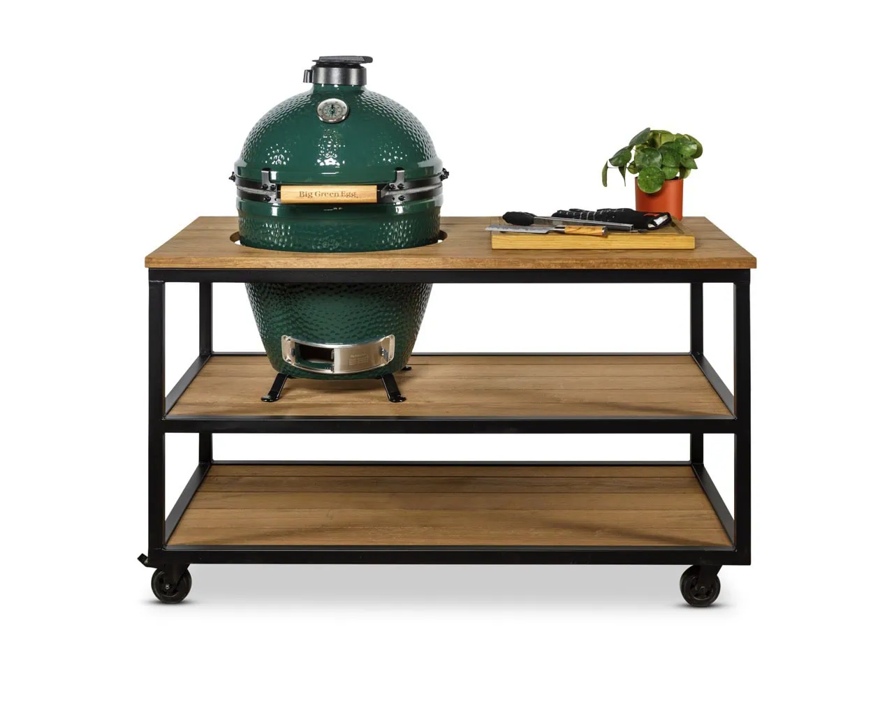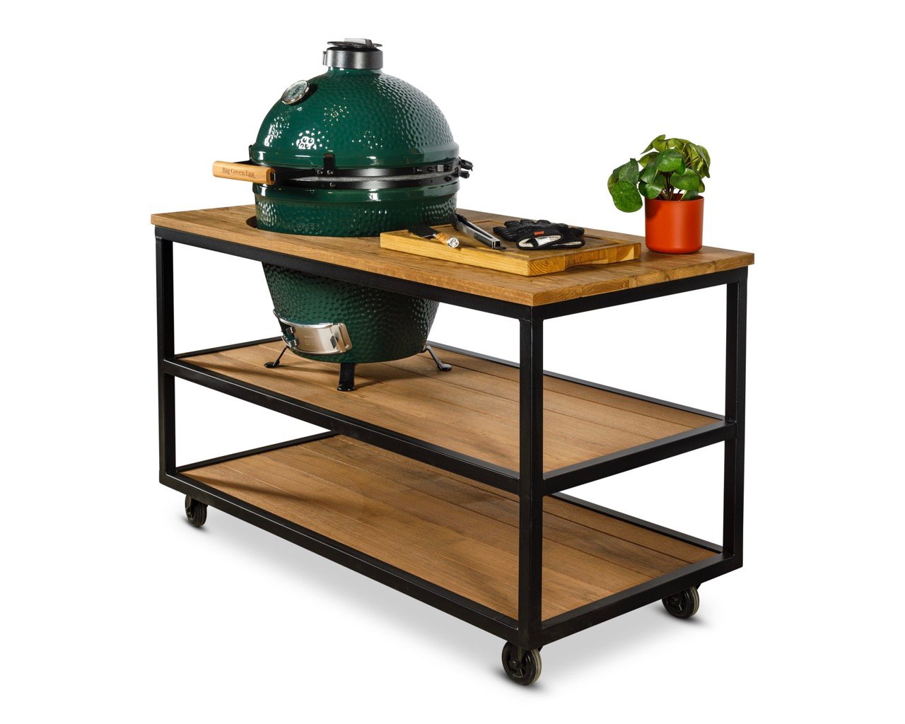 Met afmetingen van 146 × 70 × 90 cm biedt de Austin Base ruim voldoende werkruimte. Je Big Green Egg Large plaats je stabiel in het meegeleverde tafelnest of op keramische voetjes. Dankzij de vier stevige zwenkwielen — waarvan twee met rem — verplaats je de buitenkeuken eenvoudig door je tuin of terras.