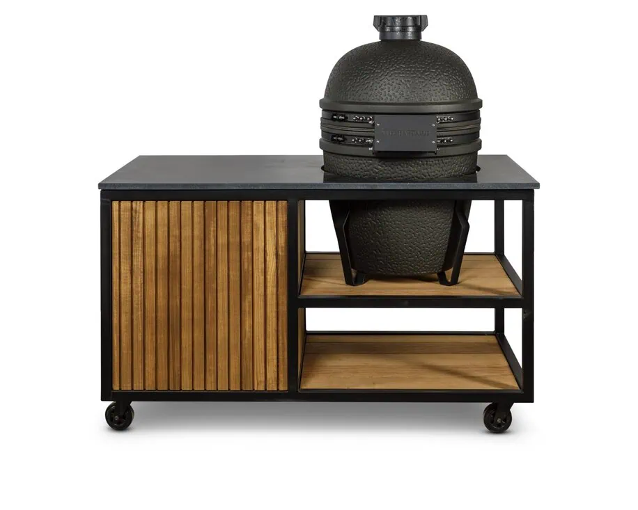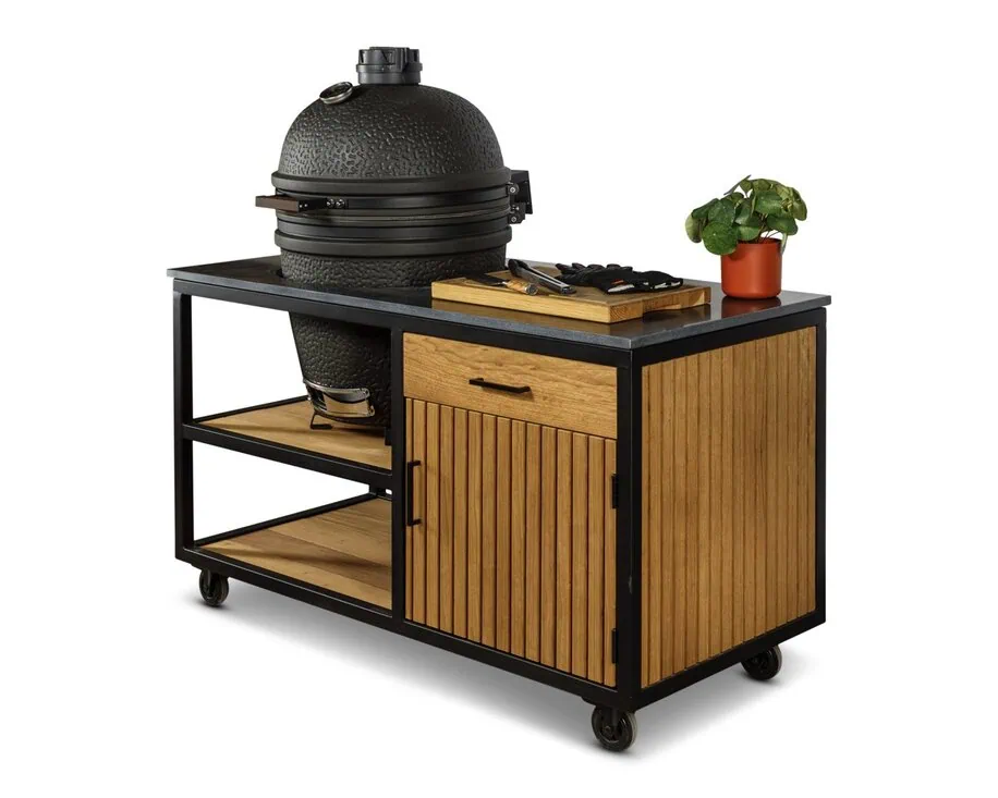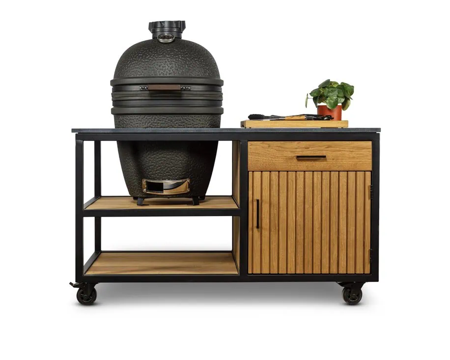 Met afmetingen van 146 x 70 x 90 cm, een ruime kast en lade, biedt de tafel voldoende ruimte voor jouw kamado en accessoires. De kamado zet je stabiel in een tafelnest of op keramische voetjes. Bovendien is de tafel gemakkelijk te verplaatsen dankzij vier stevige zwenkwielen, waarvan twee voorzien zijn van een rem. Perfect voor flexibel gebruik in je tuin of op je terras.