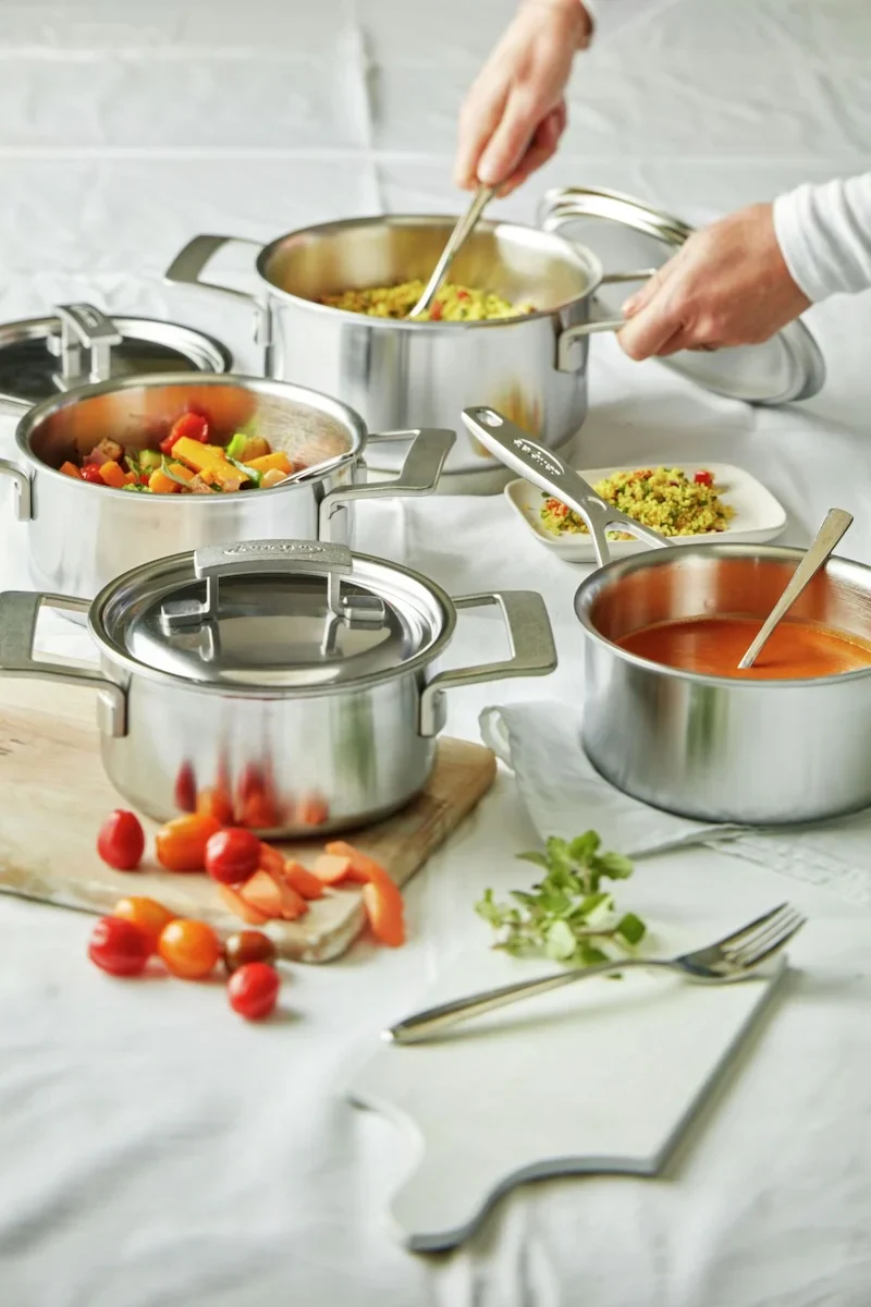 Deze set bevat drie kookpannen met deksels (16 cm, 18 cm, 20 cm) en een steelpan zonder deksel (16 cm), waardoor je alles hebt om veelzijdige gerechten te bereiden. Of je nu een delicate saus maakt in de steelpan of een rijke stoofschotel in een van de kookpannen, je geniet altijd van optimale temperatuurcontrole. De Silvinox® technologie zorgt ervoor dat de pannen niet verkleuren en levenslang blijven glanzen, zelfs na intensief gebruik.