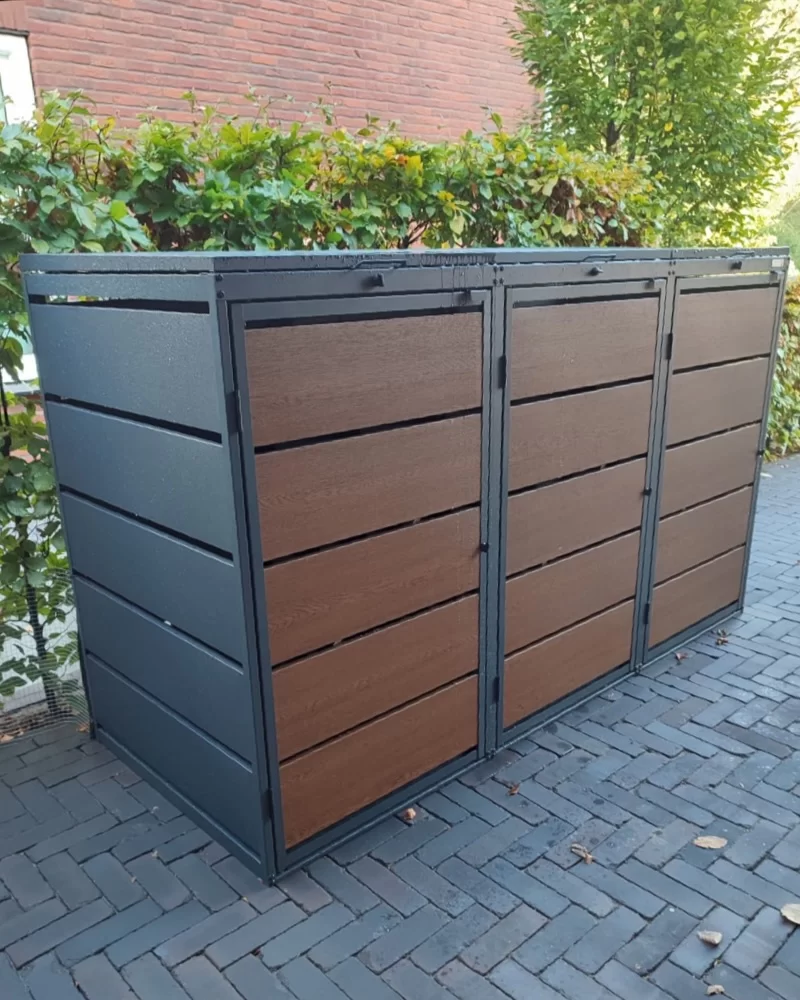 De Kuba Store is een praktische ombouw. Een populaire ombouw om zes afvalcontainers te verstoppen. De ombouw heeft twee gasveren per deksel en is gemaakt van verzinkt staal dat is gepoedercoat in RAL 7016 Antracietgrijs, de deuren hebben een poedercoating in Eiken hout, je kunt de houtnerf voelen! Een natuurlijk gezicht zonder hout dat vergrijst, kromtrekt of gaat rotten.