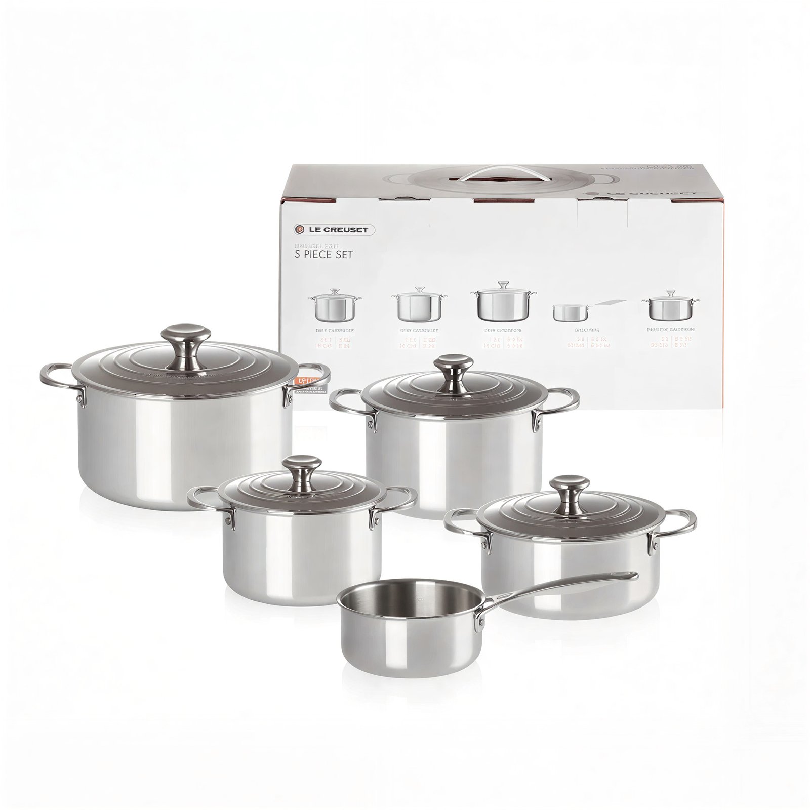 De Le Creuset Signature RVS Pannenset 5-delig is een must-have voor elke keuken. Dankzij het 3-ply materiaal, bestaande uit drie lagen metaal, biedt deze set uitstekende warmtegeleiding en -verdeling. Hierdoor kook je sneller, gelijkmatiger en energiezuiniger. Gemaakt van hoogwaardig roestvrij staal, is deze pannenset niet alleen duurzaam, maar behoudt het ook zijn mooie glans na jarenlang gebruik.