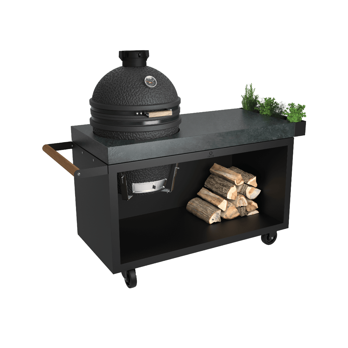 Ontdek de OFYR Kamado Tafel Black 135 PRO: een complete set inclusief kamado barbecue. Deze tafel biedt een solide basis voor je kamado, is gemakkelijk te verplaatsen en heeft volop ruimte voor al je culinaire voorbereidingen. De extra opbergruimte is ideaal om je accessoires georganiseerd op te bergen.