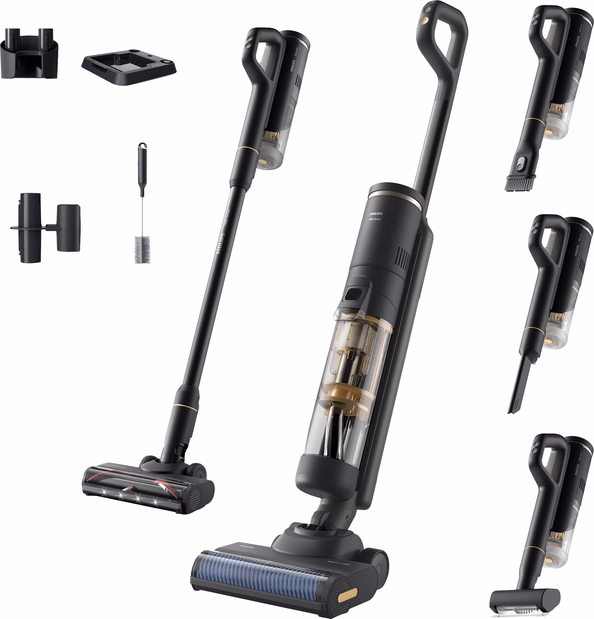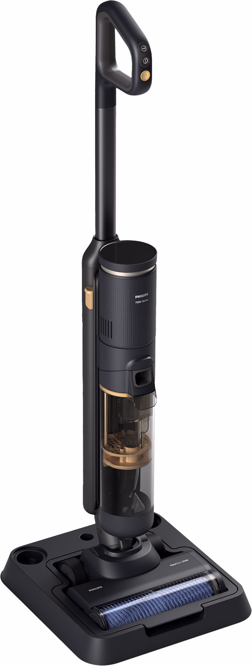 De Philips AquaTrio Series 7000 XW7264/11 is een unieke alles-in-één schoonmaakoplossing. Het systeem bestaat uit een krachtige motorunit die je op twee verschillende stelen kunt klikken: een dweilstofzuigersteel en een gewone stofzuigersteel. Met de AquaSpin-module stofzuig en dweil je tegelijkertijd, waardoor je in één beweging zowel droog vuil (zoals kruimels) als natte vlekken (zoals yoghurt) verwijdert. Voor tapijten of wanneer je niet wilt dweilen, klik je eenvoudig de droge stofzuigersteel erop.