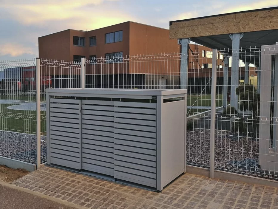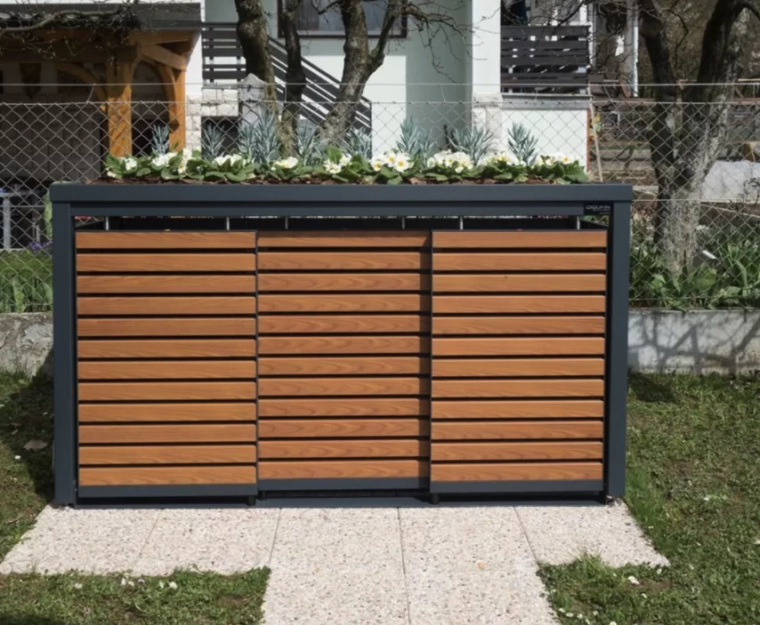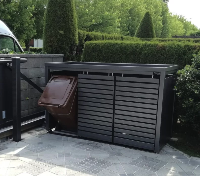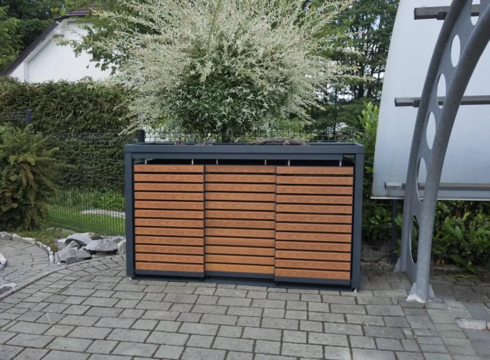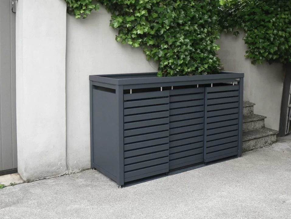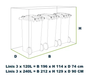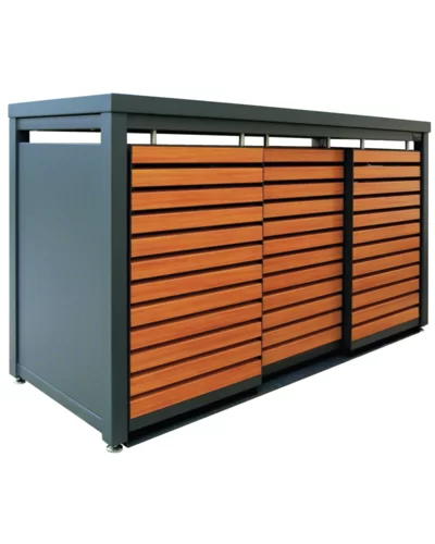 Drievoudige behuizing voor drie 240 liter kliko’s/containers met beplantbaar dak. Het frame is gemaakt van vierkante kokers (6 x 6 cm), beschikt over een achterkant en zijwanden, lamellen deuren en vanglijnen voor comfortabele bediening van de containers en beplantbaar dak (hoogte 6 cm) van aluminium. De schuifdeur heeft borstels in de schuifdeur ophanging voor bescherming tegen vuil en stof. De ombouw heeft geen tussenschot, waardoor er meer ruimte in de ombouw ontstaat.
