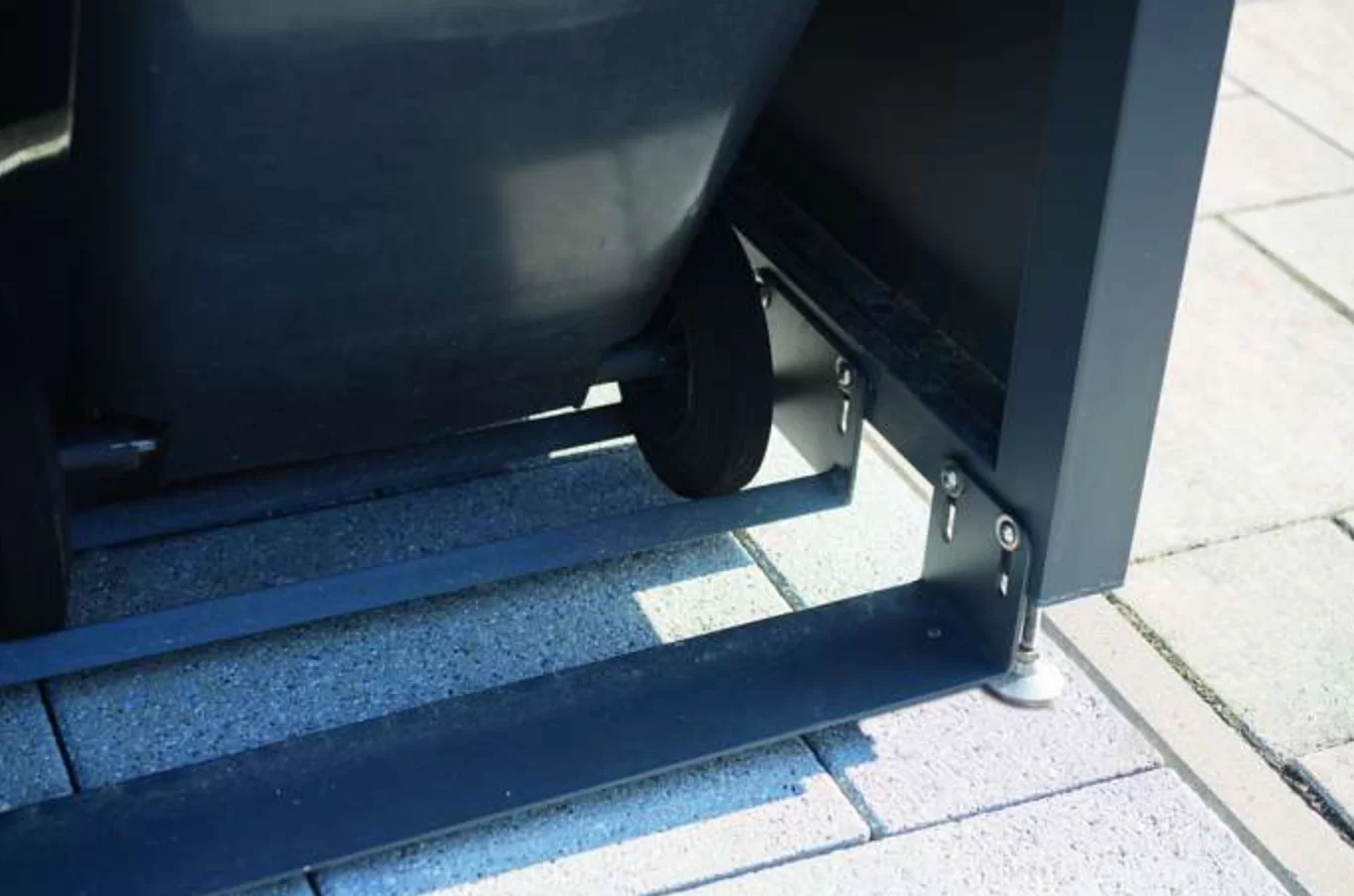 Viervoudige behuizing voor vier 240 liter kliko’s/containers met beplantbaar dak. Het frame is gemaakt van vierkante kokers (6 x 6 cm), beschikt over een achterkant en zijwanden, lamellen deuren en vanglijnen voor comfortabele bediening van de containers en beplantbaar dak (hoogte 6 cm) van aluminium. De schuifdeur heeft borstels in de schuifdeur ophanging voor bescherming tegen vuil en stof. In de ombouw zit geen tussenschot.